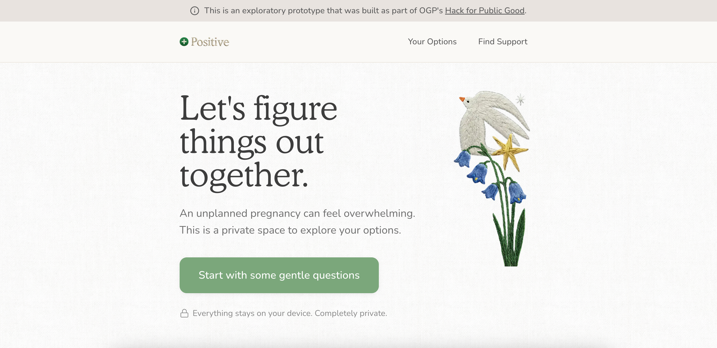 Positive is a mobile-friendly web tool that guides women through the decisions they face after an unplanned pregnancy. It provides: